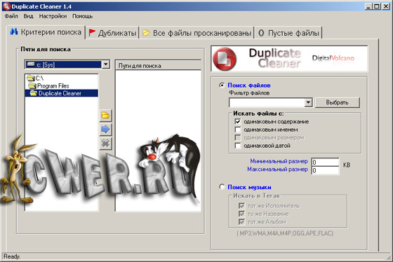 Duplicate Cleaner - мощная и профессиональный инструмент сверхточного ("Бит-В-Бит") поиска и удаления одинаковых файлов с компьютера которые напрасно занимают место, тормозят работу жесткого диска и как следствие, снижают скорость работы самого компьютера.