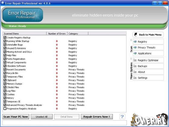 Error Repair Professional - cлужит для того, чтобы содержать Ваш PC в оптимально работающем состоянии. Error Repair Pro очистит и восстановит ошибки в Вашем PC единственным щелчком мыши. Всего несколько несколькими легких шагами, Вы сможете просмотреть весь реестр. Удалит, и исправит ошибки для любых неправильных записей и обеспечит вывод списка найденных ошибок. Так же Вы можете выборочно (вручную) исправлять любую ошибку или автоматически восстанавливать после сбоя в работе.