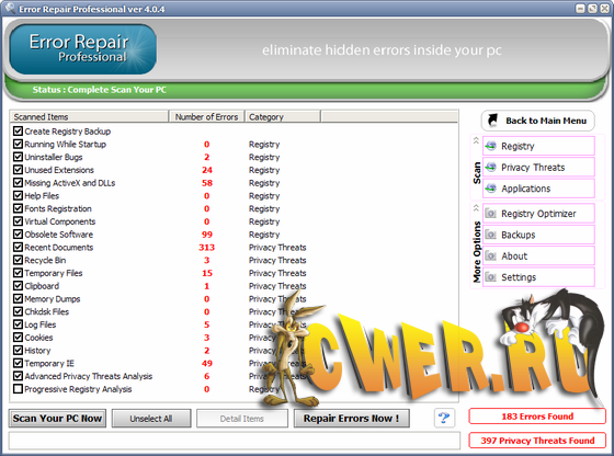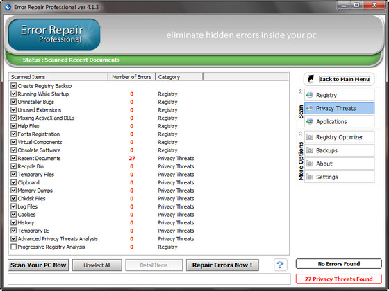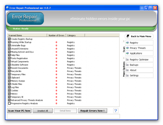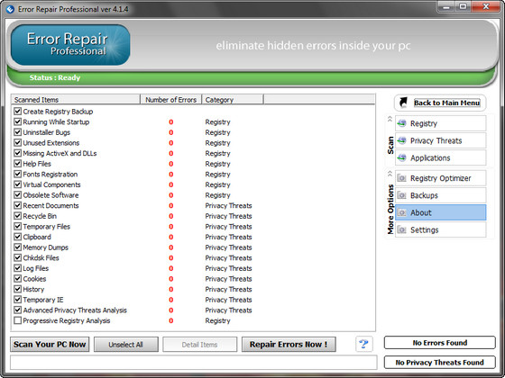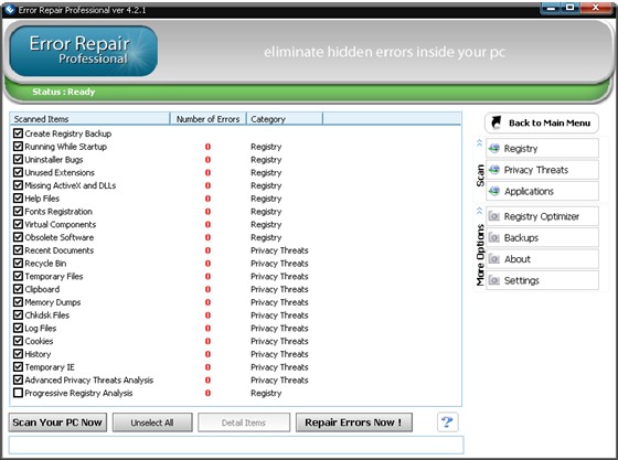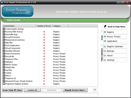 Error Repair Professional - это небольшая утилита для исправления ошибок в настройках операционной системы. Программа обладает высокой скоростью работы и за считанные секунды проверит ваш компьютер на наличие ошибочных записей и сама исправит их. Для продвинутых пользователей присутствует ручной режим работы. Найдет неполадки в реестре, библиотеках данных системы и приложений, а также серьезные ошибки, допущенные пользователем, ставящие безопасность системы под угрозу.