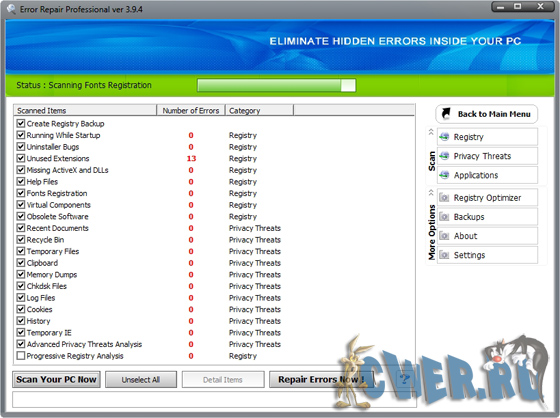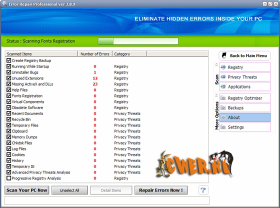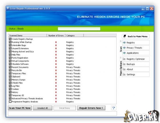 Error Repair Professional - программа найдет неполадки в реестре, библиотеках данных системы и приложений, а также серьезные ошибки, допущенные пользователем, ставящие безопасность системы под угрозу. Ошибки в операционной системе могут привести ко многим неприятностям. Избежать их можно только одним способом — вовремя обнаружить и исправить. И то и другое поможет сделать данная программа.