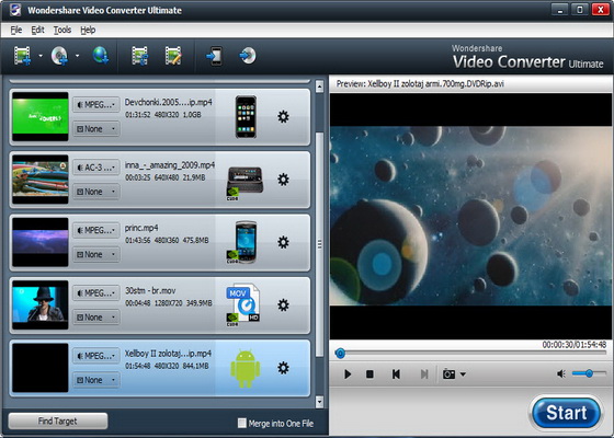 Wondershare HD Video Converter - конвертер видео файлов различных форматов в HD видео. Подерживает огромное количество форматов: MP4, MOV, 3GP, AVI, WMV, MKV, RM, MPEG-1, MPEG-2, FLV, ASF, NSV, HD ASF, HD AVI, HD MP4, HD MOV, HD WMV, HD MPG, HD VOB. Поддерживаются мобильные устройства iPod, Zune, PSP, Creative Zen, Archos, Xbox 360, iRiver. В программе реализован пакетный режим конвертирования и предварительный просмотр результата во встроенном проигрывателе. Данный конвертер отличается высокой скоростью работы и высоким качеством результата.