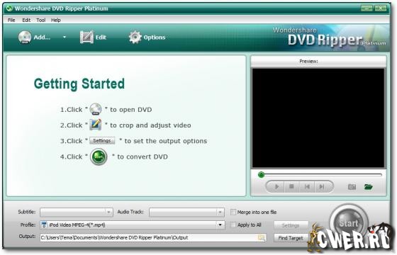 Wondershare DVD Ripper Platinum - удобный в работе и мощный DVD риппер, который может преобразовать кинофильмы DVD во все популярные видео и звуковые форматы, такие как MP4, M4V, AVI, WMV, MOV, 3GP, 3G2, MPEG, FLV, WMA, M4A, MP3, AC3, WMA, ASF, Vob, и т.д. с превосходным качеством и быстрой скоростью. Поддерживает почти все портативные видео/аудиоплейеры, что позволяет Вам легко редактировать DVD к iPod, Zune, iPhone, apple, PSP, Xbox 360, PS3, Archos, iRiver PMP , PMP, MP4/MP3, мобильным телефонам, Карманным PC, PDA, и т.д. Вы можете настроить размер файла, формат файла, и даже объединить несколько видео в 1 файл. С Wondershare DVD Ripper, Вы можете захватить любые картинки от вашего видео DVD и сохранить их как jpeg и bmp файлы.