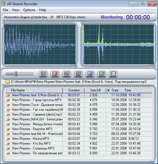 AD Stream Recorder - небольшая программа, позволяющая делать звукозаписи при этом визуализируя все происходящее в виде диаграмм. Программа поможет захватить запись из Интернета, звук из кинофильмов и музыки, которую воспроизводят популярные медиаплееры под Windows, а так же любой звук идущий с вашей звуковой платы в формат MP3 и WAV. Визуальное представление в реальном времени входных звуков в момент записи даст вам возможность сохранить их с высоким качеством.
