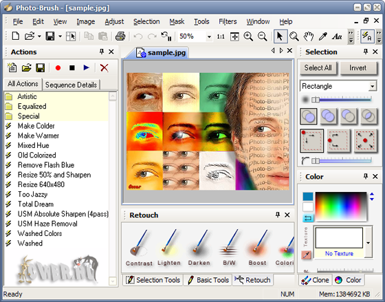 Photo Brush - многофункциональный графический редактор с функциями рисования картин и ретуширования цифровых фотографий. В Photo-Brush с помощью текстурных, артистических, натуральных или 3D кистей можно создать оригинальную картину. Есть также функция преобразования фотографий в картины. Программа поддерживает многие современные сканеры, работающие через интерфейс TWAIN и работает с графикой формата RAW (поддерживается более 100 моделей цифровых фотоаппаратов).