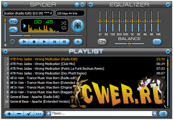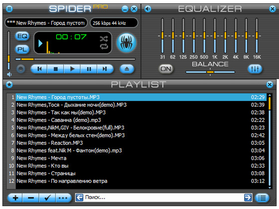 Spider Player - аудио проигрыватель и одновременно конвертер музыки. Программа воспроизводит многочисленные аудио-форматы файлов, включая MP3, AAC, AC3, Ogg Vorbis, FLAC, WAV, CDDA, WMA, MID, KAR и другие, конвертируя их между собой. Spider Player также умеет распаковывать треки из Audio CD и сохранять их в такие форматы, как MP3, WMA, OGG и WAV. В программе имеется функция редактирования ID3 тегов MP3 файлов и метаданных OGG и WMA, поиска композиций в плейлисте и добавления текстов песен в музыкальные файлы. Прослушивая мелодии можно включить визуализацию, добавлять эффекты к композициям и изменять частотный баланс, благодаря эквалайзеру в 10 полос. Ну и в заключении, плеер поддерживает потоковые интернет-радиостанции и сменные визуальные темы.