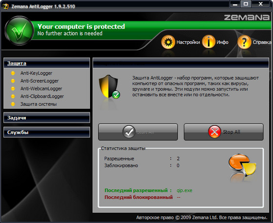 Zemana AntiLogger - мощный программный комплекс для защиты вашего ПК от наиболее опасных сетевых угроз, таких как KeyLoggers, ScreenLoggers, WebCamLoggers, ClipboardLoggers. Помимо обеспечения безопасности от вышеуказанных вредоносных программ, программа защищает доверенные компоненты системы от нежелательного доступа, например, инжекция dll/code, загрузка драйвера ядра, изменение физической памяти и т.д. Программа совместима со всеми популярными антивирусами и совершенно не влияет на производительность системы.