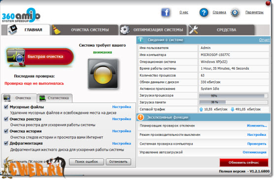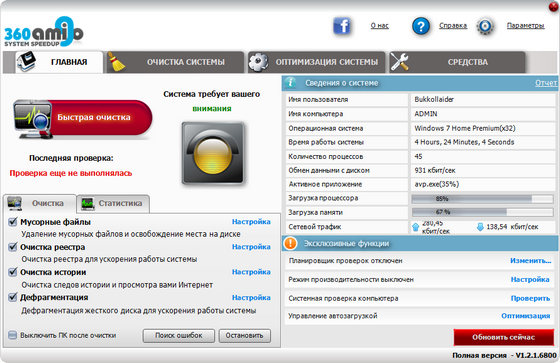 Думаете, что Ваш ПК слишком медленный? 360Amigo System Speedup может быстро вычислить и исправить широкий спектр ошибок и ускорит работу Вашего медленного ПК. 360Amigo System Speedup определяет и удаляет на Вашем компьютере все неиспользуемые файлы, оставшиеся от неправильной установки / удаления программ, он оптимизирует Ваш Windows, тем самым ускоряя время запуска системы. Кроме того, эта программа препятствует запуску вредоносных процессов на Вашем ПК. Также, она удаляет следы Вашей он-лайн активности, а именно историю просмотра, cookie-файлы, временные файлы, журнал регистраций, неверные ссылки и многое другое. Но самое главное в этой программе это то, что она мало весит, невероятно быстра и действенна (обычно её прогон занимает менее минуты). 360Amigo System Speedup выжмет максимум из Вашего ПК и сделает его снова как новым. Доступными функциями и возможностями этой программы смогут наслаждаться как новички, так и опытные пользователи.