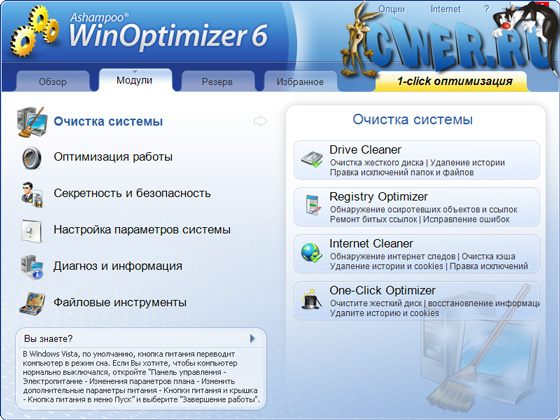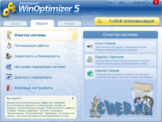 Удобная программа для оптимизации работы Windows. WinOptimizer залезет в самые труднодоступные уголки системы и прочистит их от не нужного мусора. Электронный чистильщик займется ненужными (или дублирующимися) файлами на жестком диске, удалит некорректные ключи из системного реестра, расчистит склад запылившихся файлов в во временном интернет-каталоге, настроит сетевые функции, а также проверит файловые ассоциации, настроит работу библиотек DLL и займется списком программ, загружающихся при запуске операционной системы - среди них тоже бывает много лишних.