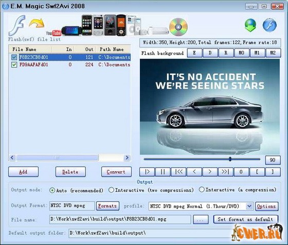 Magic Swf2Avi 2008 это мощная программа для конвертации Flash(swf) в форматы AVI, MPEG, MPEG2 TS, MP4, WMV, 3GP, GIF, H.264/MPEG-4 AVC, H.264/PSP AVC Видео, MOV, Youtube FLV, и т.п. Теперь вы можете просматривать Flash(swf) в iPod, PSP, Zune, 3GP мобильных телефонах (Nokia, Sony Ericsson, Motorola), Apple TV, iPhone и т.д. Magic Swf2Avi 2008 за один шаг конвертирует и прожигает Flash(swf) на VCD, SVCD, DVD.
