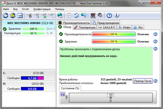 Hard Disk Sentinel - программа мониторинга, которая может помочь идентифицировать возможные проблемы жесткого диска, спад производительности или отказы жесткого диска. Отказ жесткого диска может повлечь за собой серьезные проблемы. Hard Disk Sentinel может контролировать состояние жесткого диска, включая температуру и S.M.A.R.T. Также программа измеряет скорость работы жесткого диска в реальном времени, что может использоваться в виде теста или для обнаружения возможных отказов жесткого диска, спада производительности.