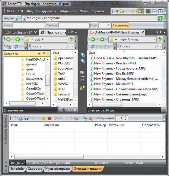 SmartFTP - мой любимый FTP клиент, с легко настраиваемым многовкладочным интерфейсом. В программе реализованы: многопоточная загрузка, докачка, работа через прокси и файрволы, SSL, FXP, операции Drag-n-Drop, работа по расписанию, ведение лог-файлов, просмотр подключаемых сайтов, закладки и возможность взаимодействия с Windows Commander.