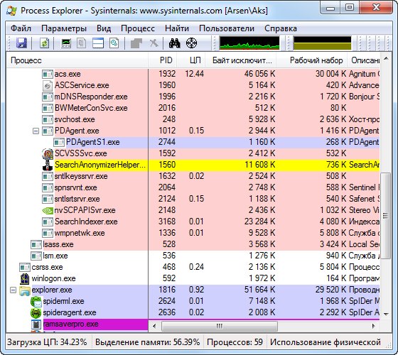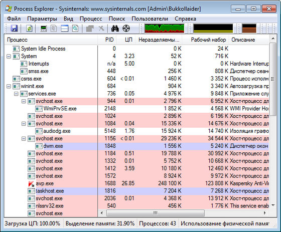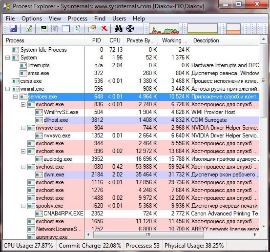 Process Explorer - компактная, но мощная программа с удобным интерфейсом для мониторинга в режиме реального времени происходящих в системе процессов. Выдает подробнейшую информацию обо всех запущенных процессах, включая владельца, использование памяти, задействованные библиотеки и т.д.