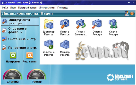 jv16 PowerTools 2008 - это одна из лучших программ для работы с системным реестром и поддержания в оптимальном состоянии. Включает в себя инструменты для работы с реестром: мощный менеджер реестра - позволяет работать со списком программ из автозагрузки и деинсталляции, со списком зарегистрированных в системе типов файлов, расширений, контекстным меню IE (с тем, в которое часто вставляют свои пункты менеджеры закачек) и некоторыми другими. Этот менеджер часто помогает вручную удалить остатки после автоматической очистки реестра программы. Возможно использование в локальной сети.