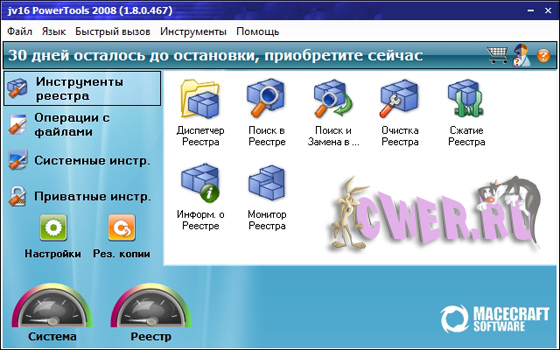jv16 PowerTools - это одна из лучших программ для работы с системным реестром и поддержания в оптимальном состоянии. Включает в себя инструменты для работы с реестром: мощный менеджер реестра - позволяет работать со списком программ из автозагрузки и деинсталляции, со списком зарегистрированных в системе типов файлов, расширений, контекстным меню IE (с тем, в которое часто вставляют свои пункты менеджеры закачек) и некоторыми другими. Этот менеджер часто помогает вручную удалить остатки после автоматической очистки реестра программы. Возможно использование в локальной сети.