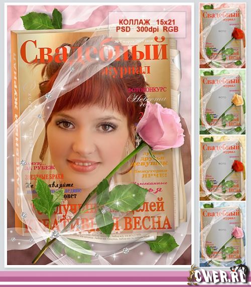 PSD исходник "Свадебный журнал" размером 1772x2480 px, 150x200 mm, 300 dpi. Все слои в том числе и тексты редактируются, шрифты прилагаются в архиве. Оригинальная рамка для оформления свадебной фотографии.
