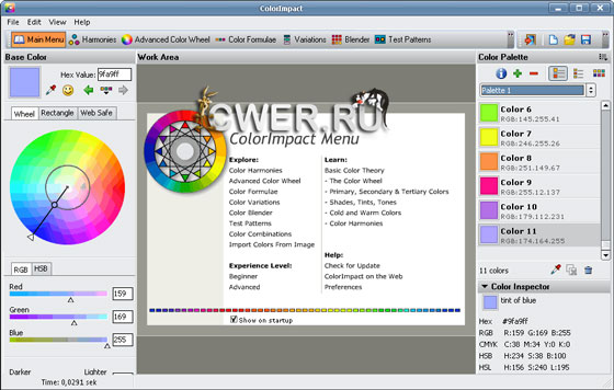 Программу ColorImpact можно назвать «венцом творения» утилит для подбора цветовой гаммы. Она создана не только для веб-дизайнеров, но и для «обычных» дизайнеров и верстальщиков, поскольку поддерживает не только RGB, но и HSB.