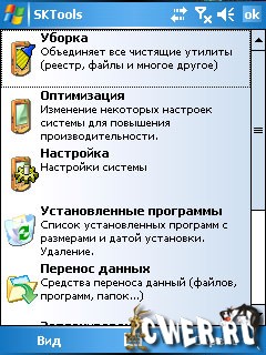 SKTools позволяет чистить файловую систему КПК, поддерживать базы данных, осуществлять backup/restore системы и многое другое. Утилита находит и удаляет ненужные временные файлы и папки, историю ссылок IE, испорченные инсталляторы, копии файлов и.т.п. Также программа позволяет работать с картами памяти - экспорт/импорт в XML файлы, форматирование карт, удалеие данных. SKTools способен отображать диспетчер задач КПК, информацию о плагинах, список запускаемых программ в момент включения устройства, добавлять и удалять программы и обладает другими возможностями.