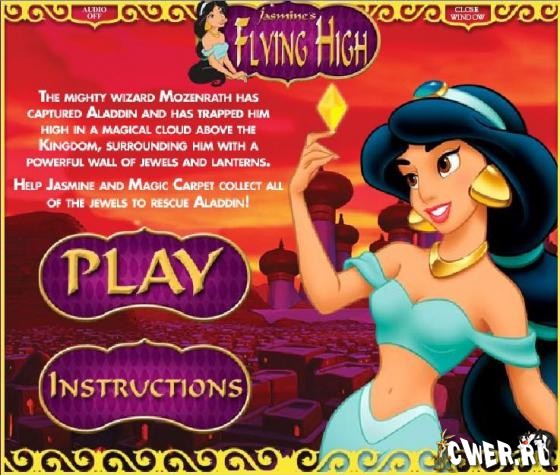 Помогите Жасмин собрать все сокровища передвигая ковёр-самолет, когда она приземляется.