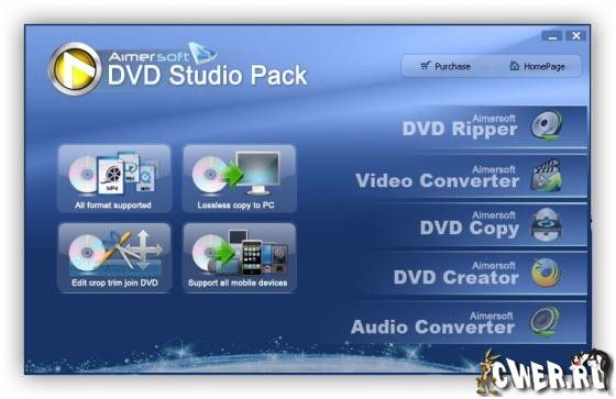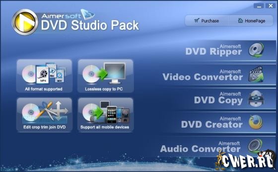 Aimersoft DVD Studio Pack - один из лучших мультимедиа пакетов, состоящий из четырех утилит: Aimersoft DVD Ripper, Aimersoft Video Converter, Aimersoft DVD Creator и Aimersoft Audio Converter. Эти утилиты помогут Вам сделать рип DVD, конвертировать видео и аудио файлы или записать эти файлы на DVD диск.