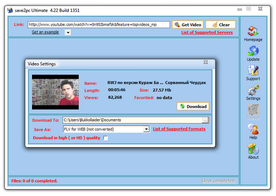 save2pc - это крайне простая в использовании утилита, которая позволяет сохранять видео с известного файлового хранилища YouTube и Google Video. Просто вставьте ссылку на нужный файл в окошке программы, укажите папку для сохранения видео, а все остальное save2pc сделает сама, вы же в результате получите интересующий вас .avi, .mpeg, .flvG файл или файл в мобильном формате mov, mp4, 3gp, mp3, wav. В программе возможно просматривать видео без дополнительных кодеков и скачивать нескольких файлов одновременно.