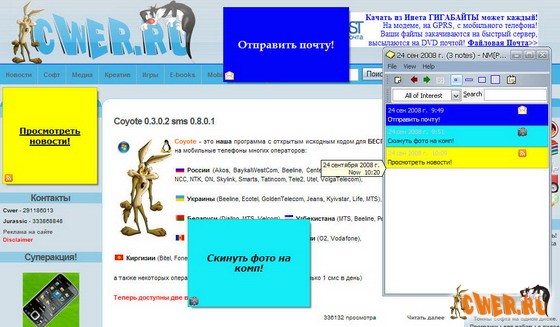 PNotes - популярная программа позволяющая располагать в разных местах Рабочего Стола "клейкие листочки", с напоминанием самому себе или другому пользователю компьютера, что нужно сделать, где что лежит, списка ссылок, найденных сайтов по какой то тематике и т.д. и т.п. Имеется русский, ивритский и ряд других интерфейсов, поддержка скинов.