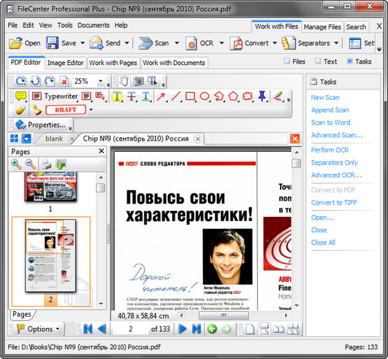 FileCenter — легкая в использовании программа для сканирования, архивирования, организации и поиска файлов на компьютере. Эта программа объединяет в едином интерфейсе большую функциональность для управления файлами, сканирования, OCR-распознавания, конвертирования файлов в PDF документы и их просмотра во встроенном просмотрщике PDF файлов. С помощью этой программы вы сможете организовать файлы в «файловые кабинеты», делать предпросмотр файлов без необходимости в их открытии, проделывать полнотекстовый поиск на рабочем и сетевых компьютерах, шифровать или полностью уничтожать любые файлы, отправлять файлы по электронной почте в качестве PDF, архивировать почту Outlook в отдельный файл и многое другое.