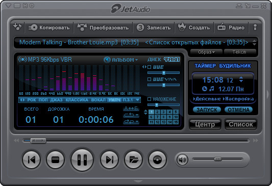 JetAudio — это универсальный проигрыватель музыкальных и видео файлов, риппер, конвертер и т.д., в общем, все в одном комплекте. Программа поддерживает практически все музыкальные форматы, умеет проигрывать MP3, MP2, WAV, MID, REAL AUDIO/VIDEO, S3M, MOD, MPG, AVI, MOV, Video/Audio CD, RealPlayer G2 и некоторые другие форматы мультимедийных файлов. Позволяет записывать аудио компакт-диски или копировать их содержимое на жесткий диск ПК. Есть возможность накладывать на композиции различные эффекты, поддерживается синхронизация для караоке, имеется эквалайзер, конвертер форматов, редактор тэгов, кроссфейдинг, субтитры и т.д.