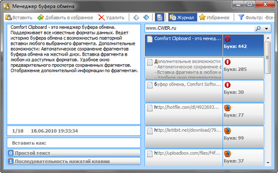 Comfort Clipboard - удобный менеджер буфера обмена. Поддерживает все известные форматы данных. Ведет историю буфера обмена с функцией повторной вставки любого выбранного фрагмента. Дополнительные возможности: автоматическое сохранение фрагментов буфера обмена на жесткий диск, вставка фрагмента в любом из доступных форматов, функциональное окно предварительного просмотра сохраненных фрагментов, демонстрация дополнительной информации по фрагментам.