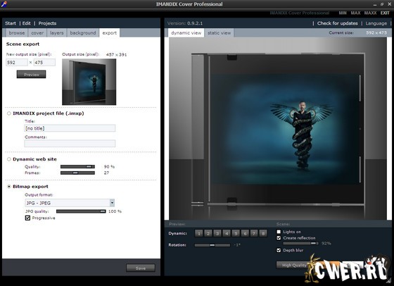 Программа для создания трехмерных изображений DVD-коробок. IMANDIX Cover позволяет создавать коробки различных стандартных размеров, генерировать сразу несколько DVD-коробок на одном изображении и просматривать созданные модели в трехмерном виде. Присутствует возможность изменения расположения трехмерных коробок в пространстве вручную или с помощью 30-ти установленных шаблонов, функция настройки цвета коробки и заднего фона картинки, а также угла наклона, падающего света и тени. Поддерживается экспорт изображений в популярные форматы (JPG, BMP, PNG, PCX, TIF), с разрешением до 2000x2000 пикселей. Кроме того, IMANDIX Cover может анимировать движение коробок в пространстве и экспортировать созданную анимацию в видео формат AVI.