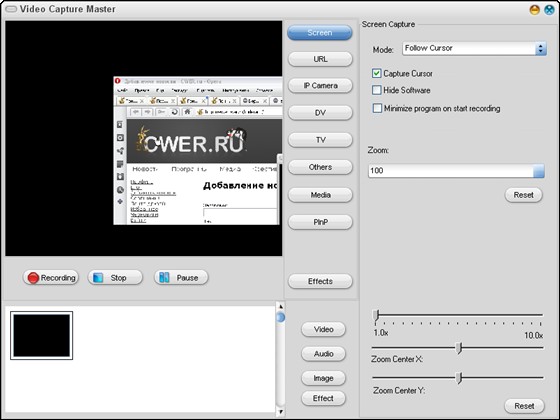 Video Capture Master - программа для записи видео и захвата скриншотов с различных видеоустройств. Поддерживаются Web-камеры, ТВ-тюнеры, устройства захвата и цифровые камеры. Причем для последних имеются средства управления, благодаря которым можно в удобном виде ими управлять. Программа предоставляет доступ к настройкам всех поддерживаемых видеоустройств. Вы сможете записывать видео в реальном времени, просматривая при этом изображение или телеканал. Имеется дополнительная возможность наложения на записываемое видео или скриншоты водяных знаков, в качестве которых может использоваться обычный текст или изображение-логотип. В качестве основного формата записи разработчиками предлагается AVI, но вы можете для захвата видео и звука использовать произвольные кодировщики, установленные у вас в системе.