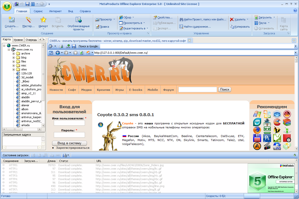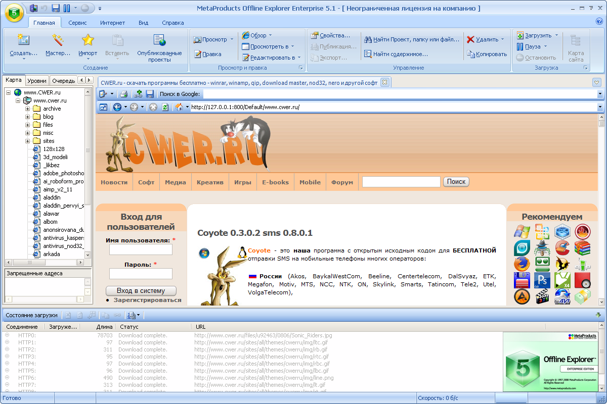 MetaProducts Offline Explorer - оффлайн браузер, поддерживающий работу как с обычными Web сайтами, так и с FTP, защищенными (HTTPS) серверами, потоковыми видео/аудио приложениями (MMS, RTSP в профессиональной версии). Встроенные средства обеспечивают комфортную работу с закачанными узлами. Есть планировщик, экспорт, импорт, встроенный браузер и много дополнительных инструментов.Мощные средства настройки позволяют закачивать даже самые сложные сайты. Производится обработка скриптов, классов Java, Flash апплетов, PDF, ASX, RAM, XML/XSL, CSS, TOC, M3U, RPM, AAM файлов.