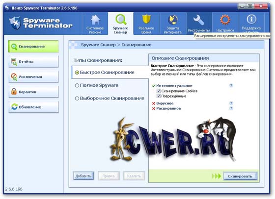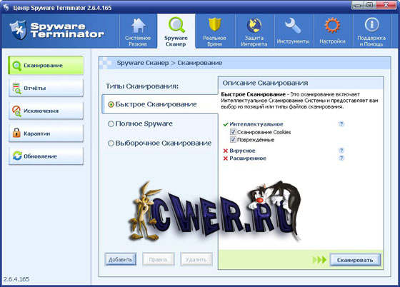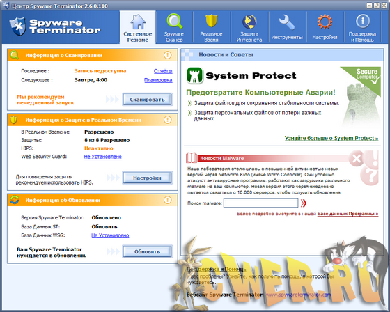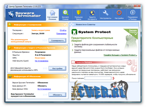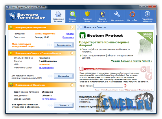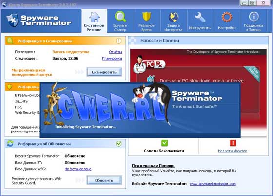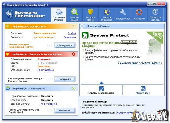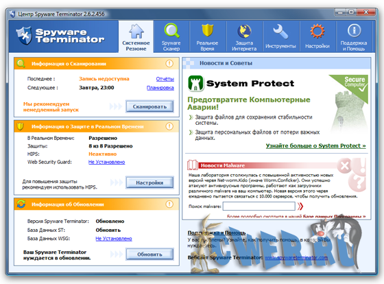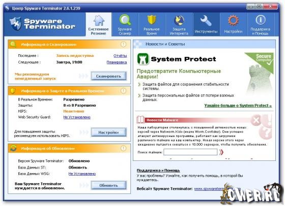 Spyware Terminator - программа для защиты компьютера от различных вредных модулей - spyware, adware, кейлоггеров и других троянов. Имеет резидентный монитор, который в реальном времени проводит мониторинг системы и предотвращает попытки проникновения на компьютер вредоносного ПО. Кроме этого, имеющийся в программе сканер поможет отыскать и поместить в "карантин" или удалить уже внедренные объекты. Работает программа очень быстро... Spyware Terminator имеет опцию автоматического обновления своих баз через Интернет, а также умеет производить проверку по расписанию.