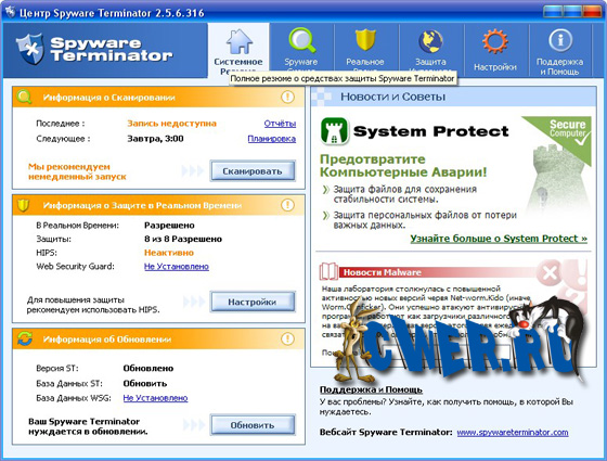Spyware Terminator - программа для защиты компьютера от различных вредных модулей - spyware, adware, кейлоггеров и других троянов. Имеет резидентный монитор, который в реальном времени проводит мониторинг системы и предотвращает попытки проникновения на компьютер вредоносного ПО. Кроме этого, имеющийся в программе сканер поможет отыскать и поместить в "карантин" или удалить уже внедренные объекты. Работает программа очень быстро... Spyware Terminator имеет опцию автоматического обновления своих баз через Интернет, а также умеет производить проверку по расписанию.