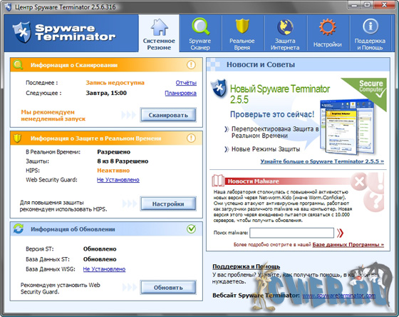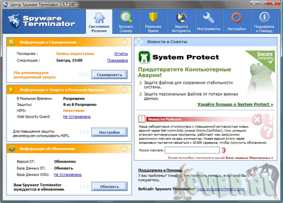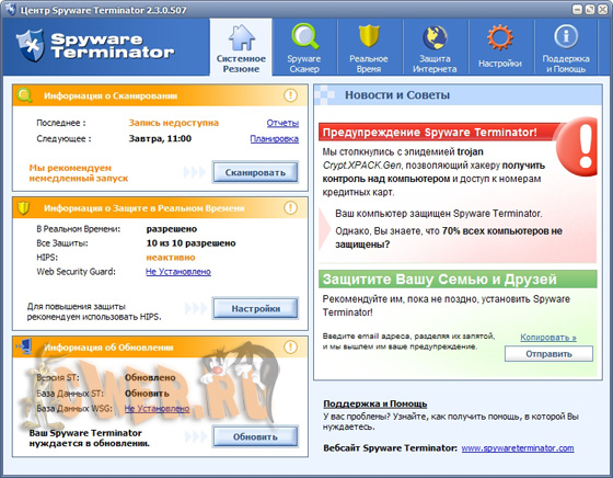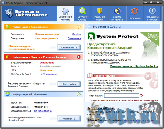 Spyware Terminator - программа для защиты компьютера от различных вредных модулей - spyware, adware, кейлоггеров и других троянов. Имеет резидентный монитор, который в реальном времени проводит мониторинг системы и предотвращает попытки проникновения на компьютер вредоносного ПО.
