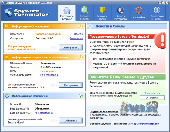 Spyware Terminator – мощный adware и spyware сканер с защитой в реальном времени, который может обнаруживать, удалять или изолировать spyware, adware, Троянов, кейлоггеров, похитителей персональных данных и другие возможные угрозы. Сканирование может быть настроено по желанию пользователя. В состав Spyware Terminator входит планировщик, а также защита в реальном времени для вашего браузера, хост-файлов, данных автозапуска и других системных областей.