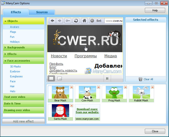 ManyCam - позволяет использовать одну веб-камеру одновременно в нескольких приложениях. Кроме этого, возможно добавление в видео текста, анимаций, времени, даты и спецэффектов (например, водяного знака), причем для любого приложения.