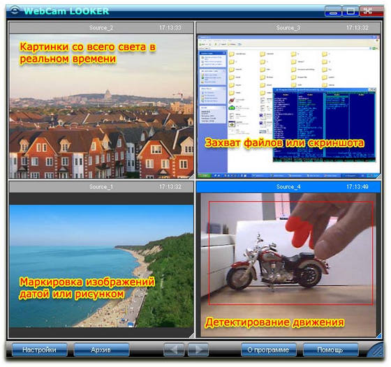 WebCam Looker - система видеонаблюдения для видео и веб-камер, доступная даже неопытному пользователю, включающая в себя детектор движения и систему слежения. Детектор движения поддерживает неограниченное количество зон наблюдения, любой формы и размеров и при необходимости информирует Вас о любом событии различными способами.
