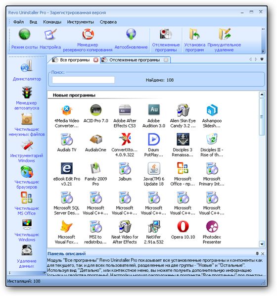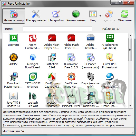 Revo Uninstaller - бесплатная утилита, которая является не просто очередным аналогом стандартного апплета "Установка и удаление программ" операционных систем Windows, а объединяет в себе достаточное количество полезных модулей и компонент для выполнения полномасштабной очистки компьютера. Revo Uninstaller работает эффективнее стандартных средств Windows, благодаря тому, что до и после деинсталляции проводит сканирование системы, обнаруживая и удаляя все внесенные удаляемой программой изменения (файлы, папки, ключи реестра).
