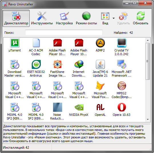Программа для удаления нежелательных приложений, установленных на вашем компьютере. Revo Uninstaller имеет продвинутый алгоритм сканирования системы до и после инсталляции и позволяет удалять оставшиеся после деинсталляции программы файлы, папки и ключи реестра. Уникальный "режим охотника" предлагает простые, но эффективные инструменты для управления (деинсталляция, остановка, удаление, отмена автозапуска) и получения информации об инсталлированных и/или запущенных программах. Revo Uninstaller также предлагает еще 8 различных утилит для очистки системы.
