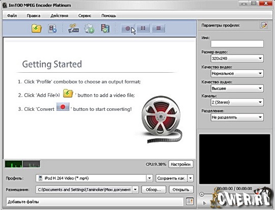 ImTOO MPEG Encoder Platinum - самый мощный из линейки от ImTOO Software Studio, высококачественный конвертор широкого спектра видео-файлов . Позволяет конвертировать файлы любых форматов, таких как AVI, MPEG, DivX, WMV, MP4, MOV, FLV, 3GP, PSP MPEG-4, iPod MPEG-4 и т.д. Помимо этого программа может извлекать аудиодорожку из видео-файлов, конвертировать большинство популярных звуковых форматов, таких как MP3, WMA, WAV, AAC, M4A и т.д. С помощью ImTOO MPEG Encoder можно быстро и с высоким качеством конвертировать любой файл в мобильные форматы 3GP, FLV, PSP, Zune, iPod, iPhone, Apple TV для дальнейшего использования в портативных устройствах. Имеется два режима работы программы: расширенны и пошаговый, с помощником. Начинающему пользователю легче работать в пошаговом режиме, а опытному пользователю предоставляется возможность использовать множество настроек для конвертирования видео в расширенном режиме.