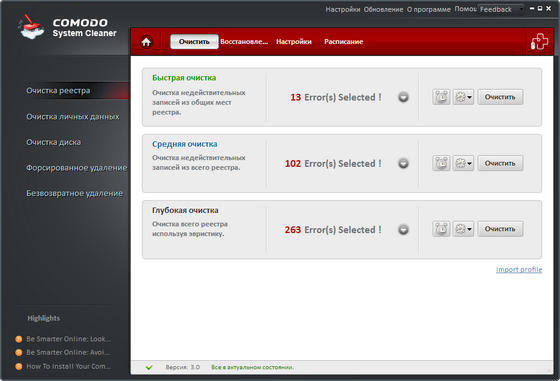 Comodo System Cleaner - комплекс программ для очистки и настройки системы. Включает в себя: очистка диска, реестра, менеджер автозагрузки, тест системы и многое другое.