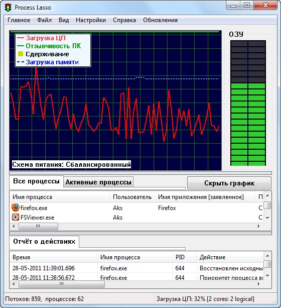 Process Lasso Pro - небольшая утилита, позволяющая вручную или автоматически манипулировать процессами, запущенными на вашем компьютере для достижения максимального быстродействия и стабильности. Эта утилита не является заменой стандартному менеджеру процессов, она, скорее, добавляет новые функции, которые позволяют оптимизировать работу ЦПУ при максимальной нагрузке. Программа дает возможность определить приоритет процессов, причем, по желанию пользователя приоритет будет задан и для всех последующих запусков. Также при помощи этой утилиты можно выполнить завершение работы нежелательных процессов. Кроме этого, программа позволяет вести статистику запущенных процессов. Программа имеет отдельную версию для 64-битных систем, а интерфейс программы обладает поддержкой русского языка.