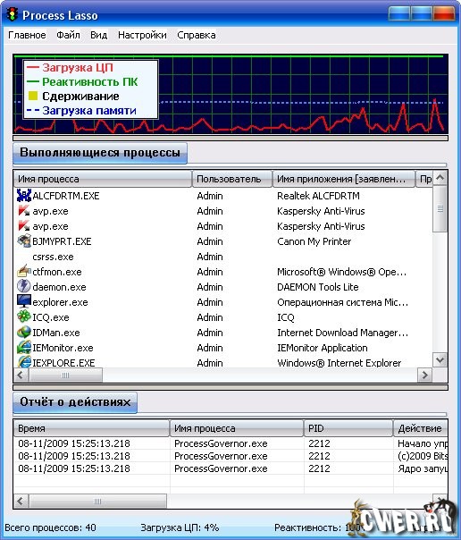 Process Lasso Pro - небольшая утилита, позволяющая вручную или автоматически манипулировать процессами, запущенными на вашем компьютере для достижения максимального быстродействия и стабильности. Эта утилита не является заменой стандартному менеджеру процессов, она, скорее, добавляет новые функции, которые позволяют оптимизировать работу ЦПУ при максимальной нагрузке. Программа дает возможность определить приоритет процессов, причем, по желанию пользователя приоритет будет задан и для всех последующих запусков. Также при помощи этой утилиты можно выполнить завершение работы нежелательных процессов. Кроме этого, программа позволяет вести статистику запущенных процессов. Программа имеет отдельную версию для 64-битных систем, а интерфейс программы обладает поддержкой русского языка.