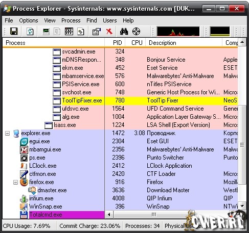 Process Explorer - компактная, но мощная программа с удобным интерфейсом для мониторинга в режиме реального времени происходящих в системе процессов. Выдает подробнейшую информацию обо всех запущенных процессах, включая владельца, использование памяти, задействованные библиотеки и т.д. Имеет мощную систему поиска, позволяющую искать процессы, открывающие специфический дескриптор или загружающую определенную DLL. Кроме этого, Process Explorer допускает изменение приоритетов процессов и их "убийство".