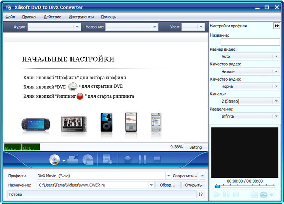 С помощью Xilisoft DVD в DivX Converter сможете конвертировать DVD в XviD, DivX(AVI), доступна нормализация аудио, нормализация уровня громкости, выбор и настройка параметров сохранения, автоматическая нарезка на фрагменты результата, выбор файлов на DVD для последующего извлечения и конвертирования, предварительный просмотр видео, высокое качество и удобство в работе, простой и удобный интерфейс.