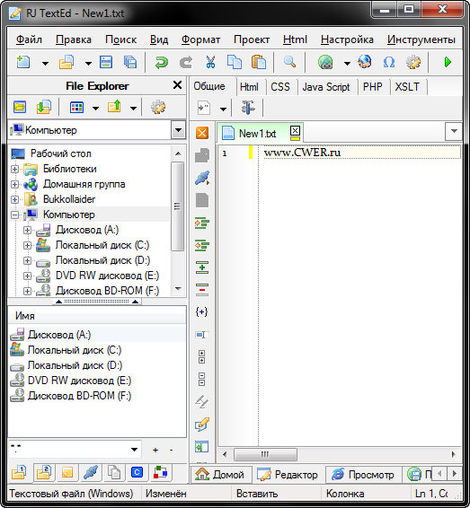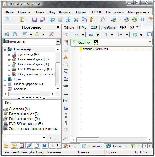 RJ TextEd - полнофункциональный текстовый редактор с поддержкой Юникод. Программа отлично подходит для работы с веб-документами: PHP, ASP, JavaScript, HTML и CSS. Функциональность RJ TextEd выходит за рамки простой работы с текстовыми файлами и включает в себя: поддержку редактирования CSS/HTML со встроенным просмотром результатов, проверку синтаксиса, автозавершение, шаблоны, отмену изменений, поддержку drag'n'drop и многое другое.