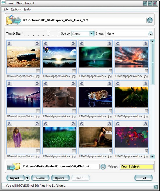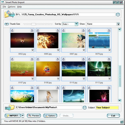Smart Photo Import - небольшая и быстро работающая утилита, которая поможет Вам в импортировании снимков с цифровой камеры на компьютер. Главная особенность данной программы состоит в том, чтобы импортировать фотографии с вашей цифровой камеры или любого другого устройства (флэшки и т.д.) и автоматически организовывать их в папках на Вашем компьютере. Таким образом Вы не будете должны организовать их позже, и Ваш фотоархив всегда будет в идеальном состоянии.
