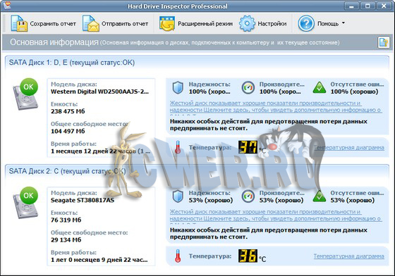 Hard Disk Sentinel - утилита для мониторинга и контроля состояния жестких дисков. Позволяет определить потенциальные проблемы, снижение производительности и возможные сбои. Может предупредить пользователя в случае обнаружения неполадок или превышения температуры. Ее возможности явно не покажутся лишними, особенно в случае особой ценности хранимых данных при росте объема накопителей. Программа отслеживает статус жестких дисков, включая показатели температур и параметры S.M.A.R.T. (Self-Monitoring, Analysis and Reporting Technology, технология, встроенная в большинство современных накопителей) для каждого жесткого диска.