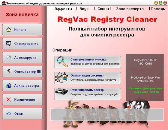 RegVac Registry Cleaner - замечательный набор из 10-и утилит для очистки реестра в системе Windows от "мусора". Несмотря на огромное количество подобных программ в RegVac содержаться некоторые утилиты которых нет больше нигде. Программа позволяет убирать оставшиеся после удаления программ записи в реестре, удалять следы шпионских программ, редактировать меню «Открыть с помощью…» и др. Registry Cleaner оптимизирует реестр таким образом, чтобы Windows запускался в оптимальном состоянии. Кроме того, программа может создавать резервные копии реестра на случай возникновения экстренной ситуации.