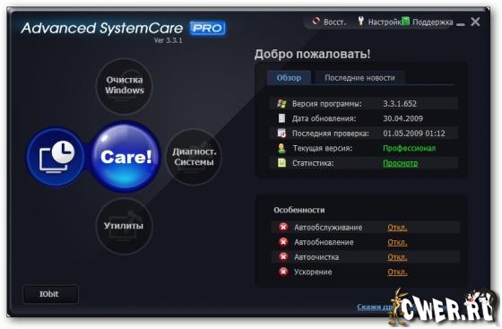 Advanced SystemCare (ранее Advanced WindowsCare)- программа, включающая в себя множество модулей для оптимизации, настройки и повышения производительности компьютеров, находящихся под управлением операционными системами Windows 2000/XP/Vista. Благодаря возможностям программы вы сможете очистить ПК от шпионского и рекламного ПО, обнаружить и заранее устранить возможные угрозы и бреши в системе безопасности ОС, исправить ошибки в системном реестре, очистить временные и ненужные файлы, управлять списками автозагрузок, оптимизировать работу систем.
